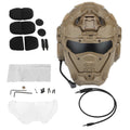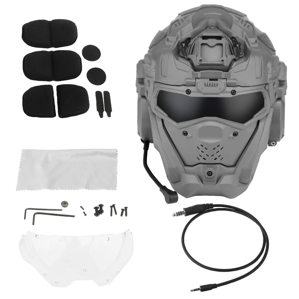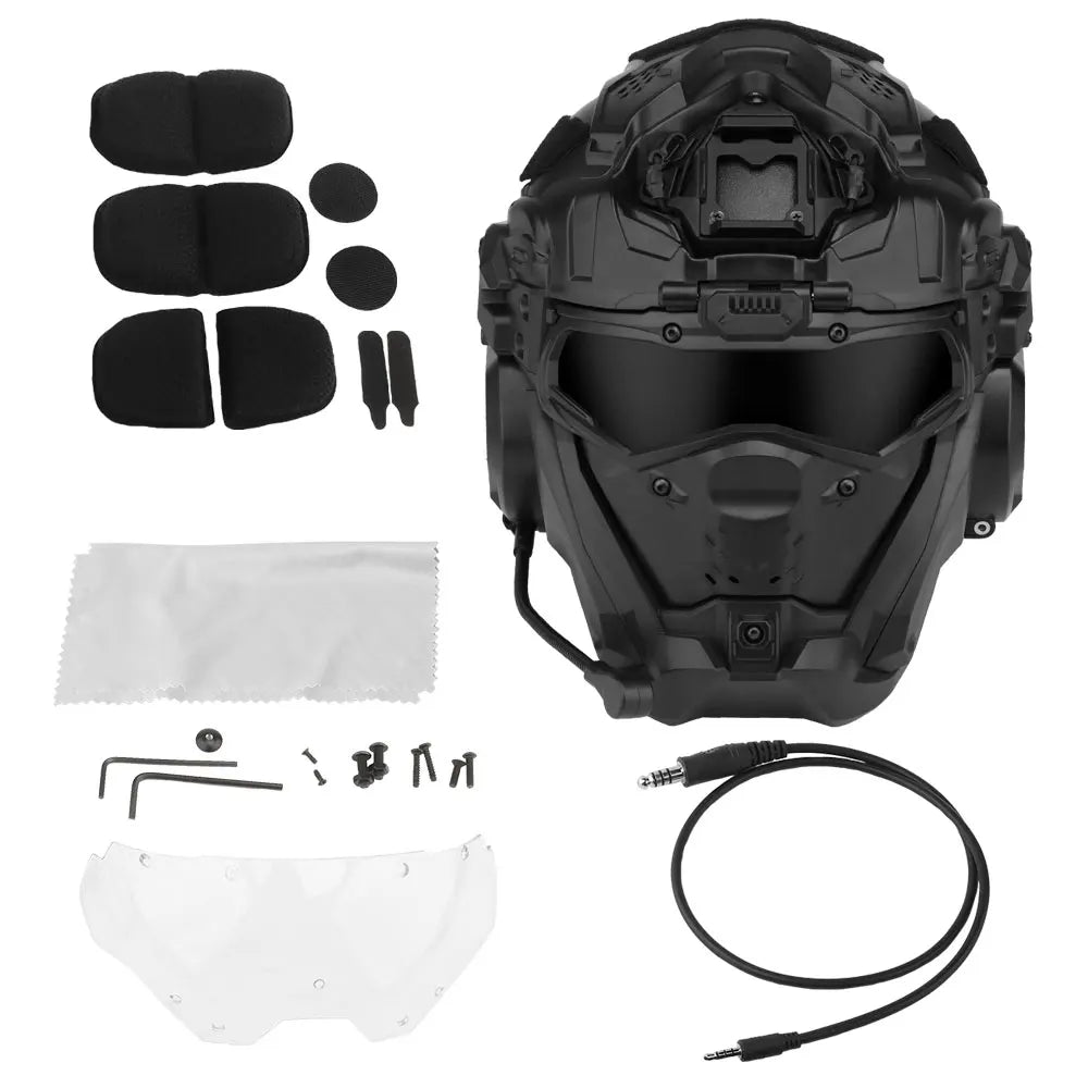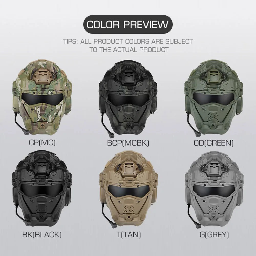 Casco táctico integral con auriculares y ventilación antivaho. Ideal para airsoft y deportes al aire libre. Disponible en varios colores.